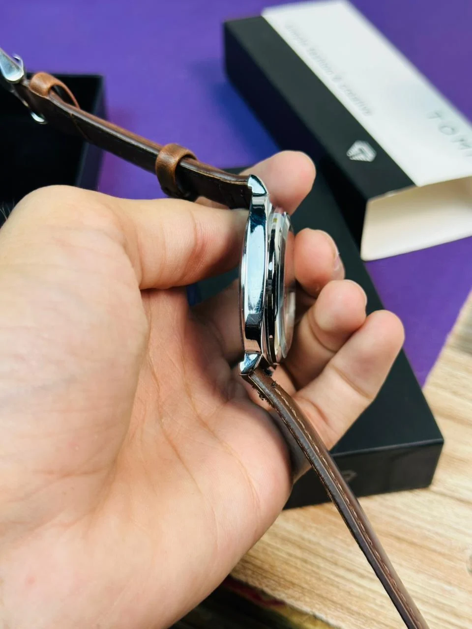 Paired with a deep coffee-brown leather strap, this watch offers maximum comfort and durability. The
